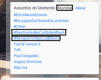 No começinho da noite de hoje, os fãs de Lua e Arthur subiram Tag's:#SeuSorrisoMeConfortaArthurA e #SempreContigoLuaBlanco, as mesmas foram parar nos assuntos mais comentados mundialmente. Confira: